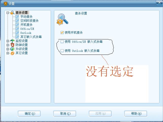问题现象:在瑞星的详细设置-查杀设置里的OFFICE和OUTLOOK两个嵌入式杀毒选项选定后,重新打开“查杀设置”里这两个选项依然是没有选定的状态。