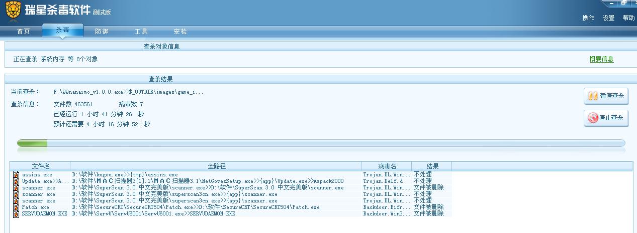 另外发现查杀时间和进度条显示的也不正确,我的硬盘一共四个分区,如上图已经到了最后一个分区,可是显示还需要那么长时间,比前面三个分区合起来都多,我的F盘里主要放了一些电子书和十部电影,还有五十多张个人照片