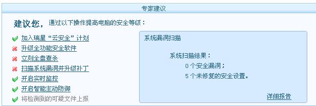 既然提示有0个系统漏洞,则建议中的“扫描系统漏洞与升级补丁”就不应该是红叉