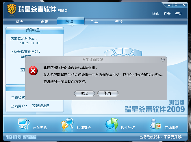 问题现象:点击防御后出现对话框“程序出现致命错误导致非法退出