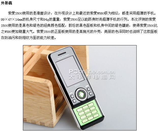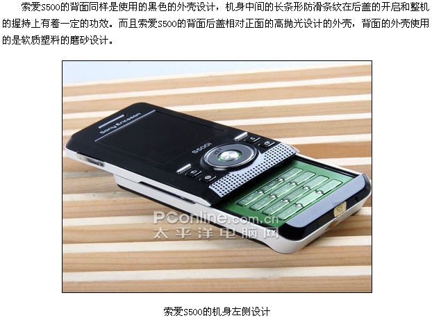 索尼爱立信于07年5月在上海举办了主题是“超越 合作 共赢”的2007中国峰会暨新品发布会,会上共计发布了四款新机,其中就有一款稀少的S系列机型。索爱S系列的手机定位和W和K系列的机型定位稍微有点区别,这款最新的S500使用的是滑盖设计,整体的外形和索爱W580极为类似。索爱S500将会有两种时尚的颜色搭配,包括峻峰黑和春蕾黄。S500更强调设计的活力、动感,桌面视觉效果和手机菜单可以随季节变换和日夜轮回而自动变幻。
