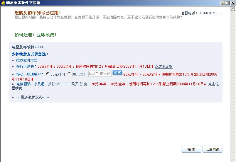 注:瑞星产品本身到期,这种可能要比前2种可能性要少,所以建议大家,如果瑞星提示过期,先不要急着去续费,先查看一下是否是前2种情况,或者联系瑞星客服,核对自己的产品是否过期,证实确实过期了再去续费。