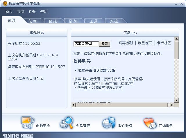 在瑞星的使用过程中,有时会遇到无法升级,杀毒软件杀不了毒,变成了查毒版,同时还有软件过期之类的提示,对于这种情况,可以做如下操作: