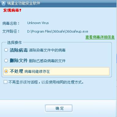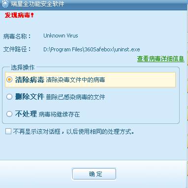 Unknown Virus 不处理 2008-10-20 15:26:15 手动查杀 D:\Program Files\360safe uninst.exe 本地服务器