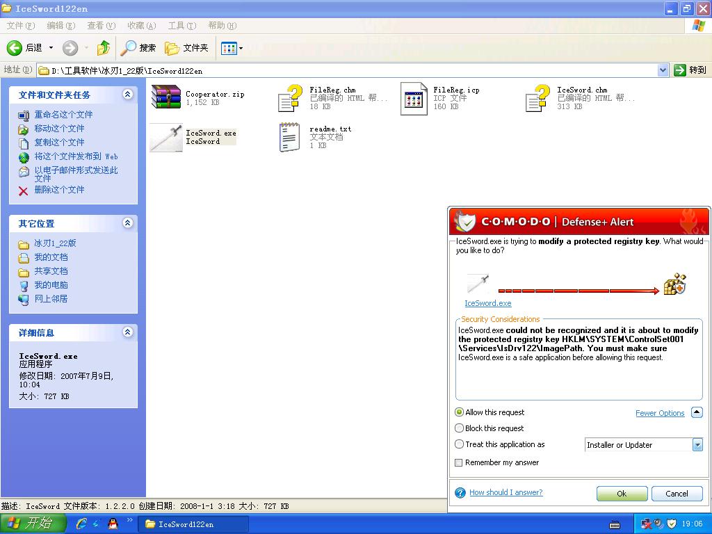 卸载毛豆个人防火墙安装毛豆CIS后(强烈鄙视煤球没提前介绍,导致我多做了无用功),想看看它的D+究竟有多强。就从测试冰刃主程序(有SYSTEM权限,毛豆会不会察觉呢?)的运行说起吧。