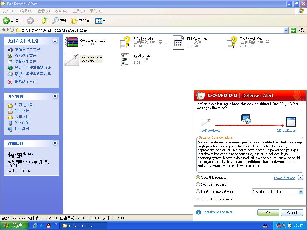 7、双击运行冰刃主程序(这里要注意对图中标记进行相关设置),对所有确认对话框一律在勾选allow the request(允许此请求)项目后,再单击OK(完成)(恭喜你,噩梦开始了……):