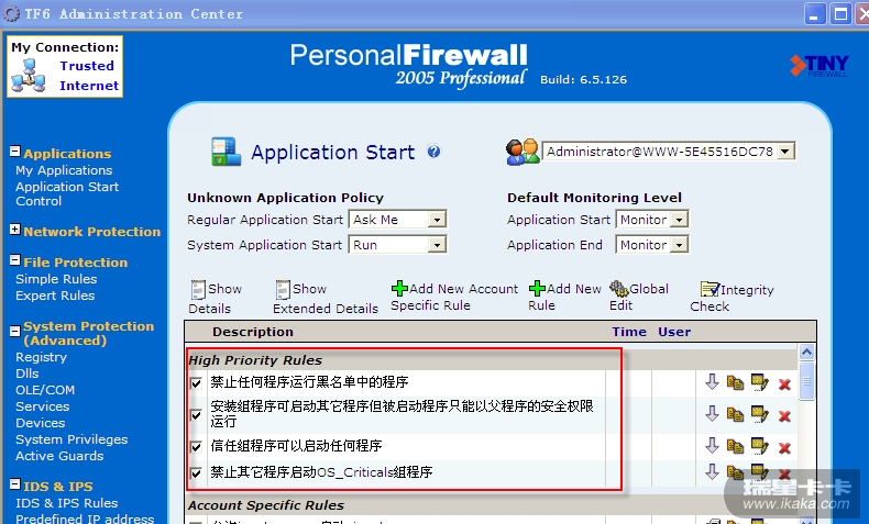 ----对trusted成员,对加载基本的dll们一律允许并不记载,其他的一律提问并记载。规则在非系统帐户下运行。