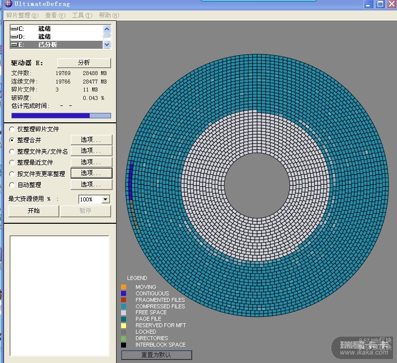 爽啊,用UltimateDefrag整理了我的E盘碎片,没想到居然整理完后碎片文件只有3个,而且破碎度只有0.043%,比WINDOWS XP自带的还要好用啊~~~~
