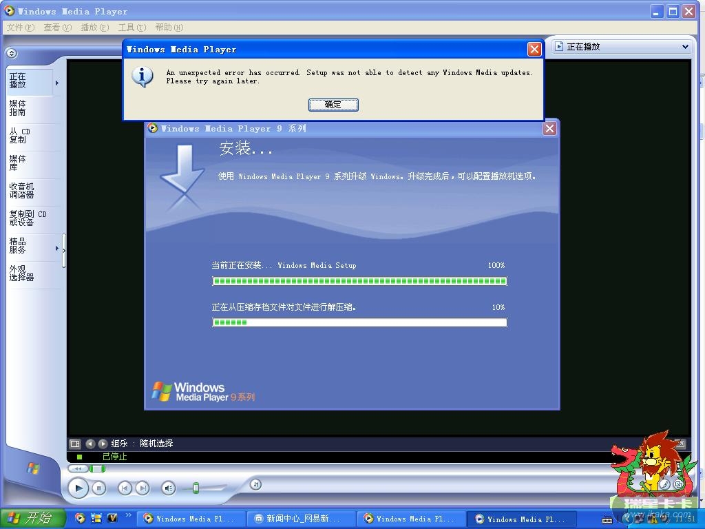 Windows Media Player 9更新时出现下列对话框,更新失败。