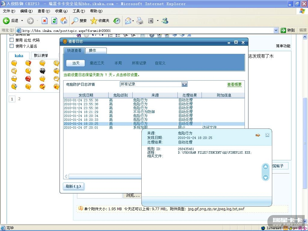 今天上QQ突然瑞星提示发现危险行为什么的,一开始没在意,后来重上QQ又出现后来一查日志发现有了木马?