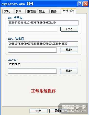 2、原windows目录及dllcache目录下的explorer.exe被病毒替换了。比较这三个程序的MD5即可判明: