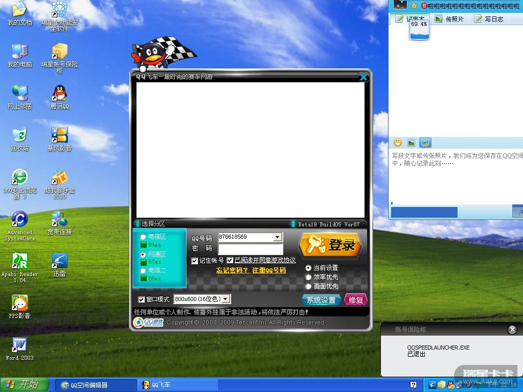 玩QQ飞车,不知道怎么就报告错误(一堆英文好麻烦啊!),然后保险柜自动退出:第二个问题,QQ飞车还没登陆完毕,保险柜就取消保护(如下图),天哪,这是怎么回事啊?!