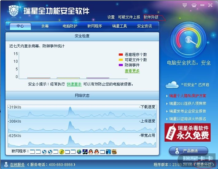 原先分开安装的瑞星杀毒和卡卡基本没出什么问题,自从免费后安装了全功能防护软件,就刚安装的时候可以更新,然后就再也无法更新。 1. 打开主界面后,右下角显示需要升级,然后点升级按钮,直接没有反应;