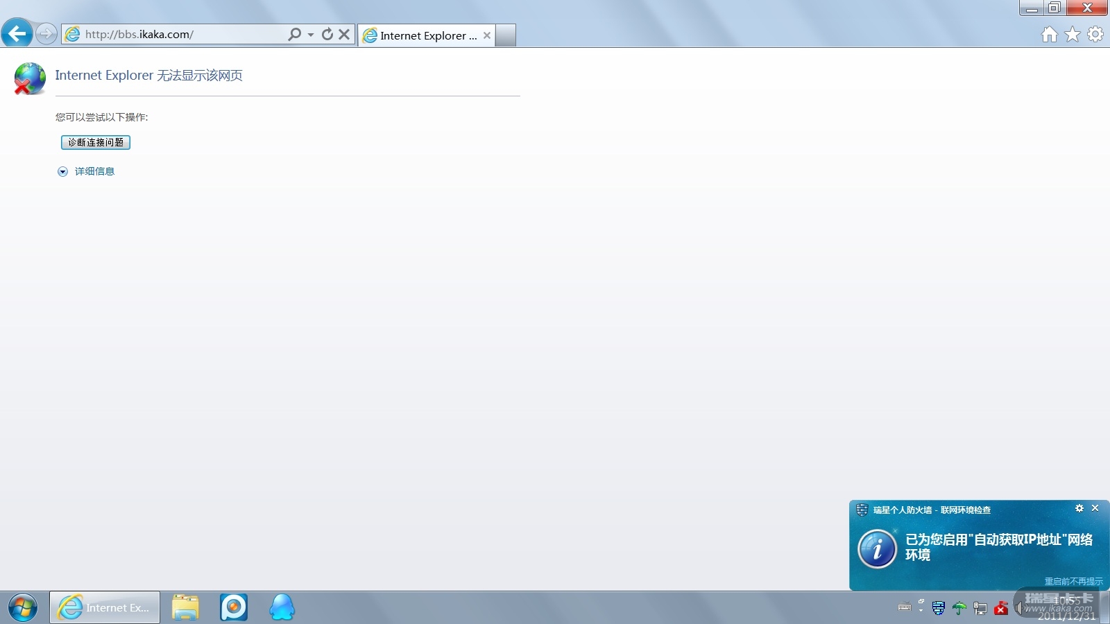 重启系统后打开浏览器出现连接不到服务器,然后跳出下图提示后可以上网