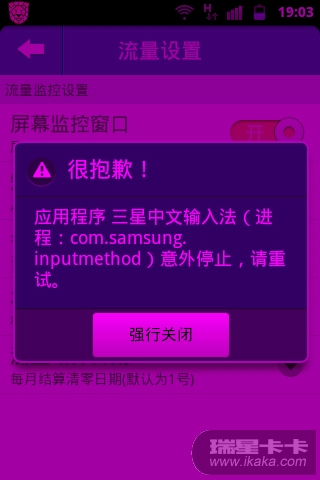 还有流量监控里面无设置流量限额时,不能输入,过一会显示应用程序:com。anmsung。inputmethod 意外停止,请重试