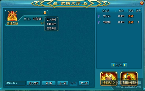 按钮,进入试练大厅,在试练大厅可单击房间在弹出来的选项中选择进入房间、私聊房主、查看房主。