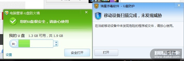 1.U盘插入启动扫描的时候 弹窗太大,截图是与QQ安全管家对比的