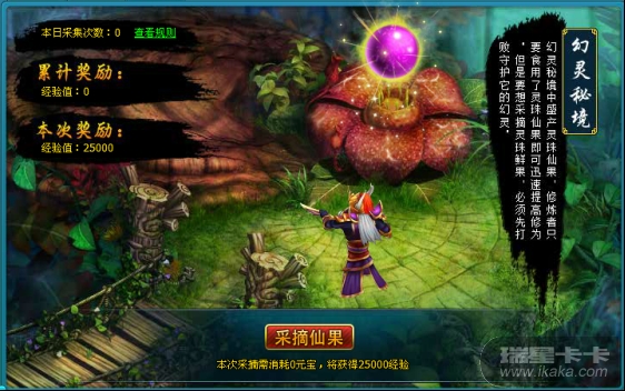幻灵秘境为嘉年华界面下的一个新功能,玩家每天可免费进入秘境采摘仙果一次,额外花费元宝还可重复进入采摘,不限采摘次数。采摘仙果必须先击败守护仙果的幻灵,采摘仙果成功可以获得大量经验奖励,可以极大的加快升级速度。