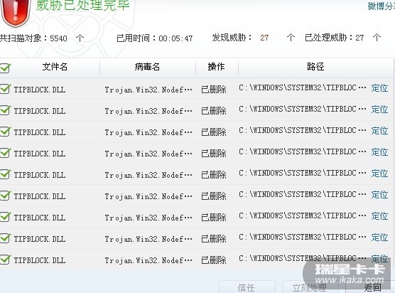 求客服解决下呀,这木马开机一遍杀1次,都杀了半个月了,就是杀不死。C盘里面的TIPBLOCK.DLL。