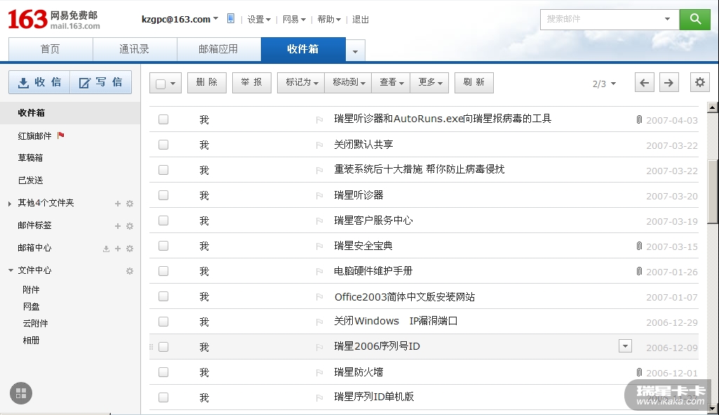 我是2003年在单位接触的瑞星,2005年单位开始用“瑞星中小企业版”统一管理着分布在各站的电脑,感觉不错,2006年单位领导买了单机版的瑞星产品,因为单位安装了监控,可以远程看到我在电脑上的操作,感觉不方便,于是我将领导的三个序列号抄下来[发到自己的电脑专门邮箱里(注:我将电脑有用的都发到自己邮箱里)],安装到我的电脑上,这是邮箱的截图,