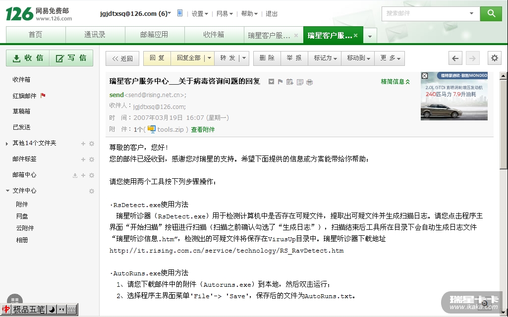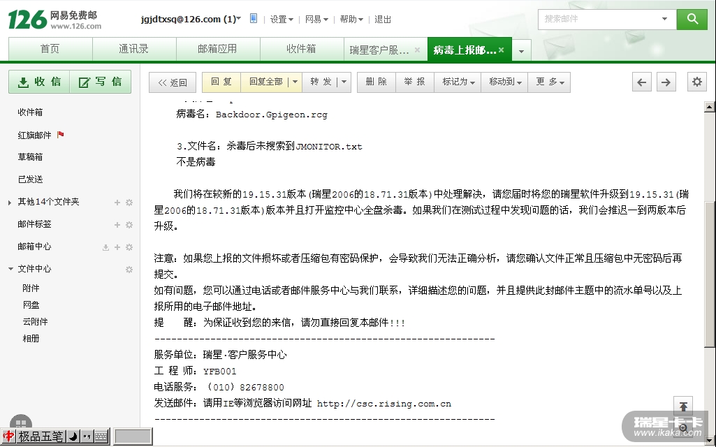 由于不在单位的“瑞星中小企业版”保护,同事家的孩子到我的机器上玩,结果中招了,于是在2007年3开始求助瑞星工程师,并得到了圆满解决。这个邮箱是单位的邮箱。
