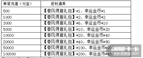 【春风得意礼包】打开有机会获得:神佑石*1、灵幻石*1、魔晶碎片*1、灵器进阶仙玉*3、喵星人之魂*1、一级控制强化石*1、护神丹*1、幸运金币*2。温馨提示:单笔充值奖励可重复领取,不设上限,奖励物品均为绑定,以信函方式发放。3累积充值大礼活动期间,累积充值达到指定额度,还可以获得以下超值丰厚的奖励哦!