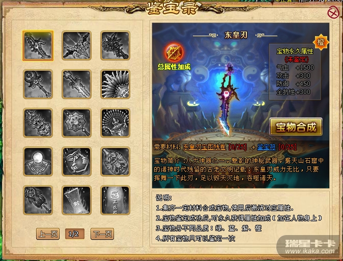 传闻,五百年前的各种奇珍异宝,包括八大神器如今惊现在飞仙各大常规副本中,待有能力者去鉴定收集。这些神秘的宝物,激活后可以大幅增加人物固定属性。另外,收集宝物越多,增加属性就越多!