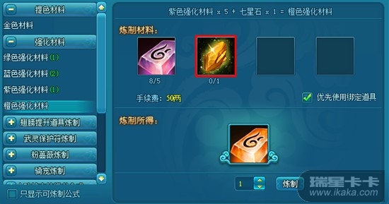 1、紫色强化材料×5 +七星石×1 = 橙色强化材料