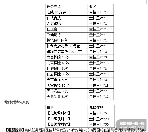 活动期间,玩家完成以下指定游戏内容可获得金枝玉叶,不同数量金枝玉叶可兑换不同级别的散财树;
