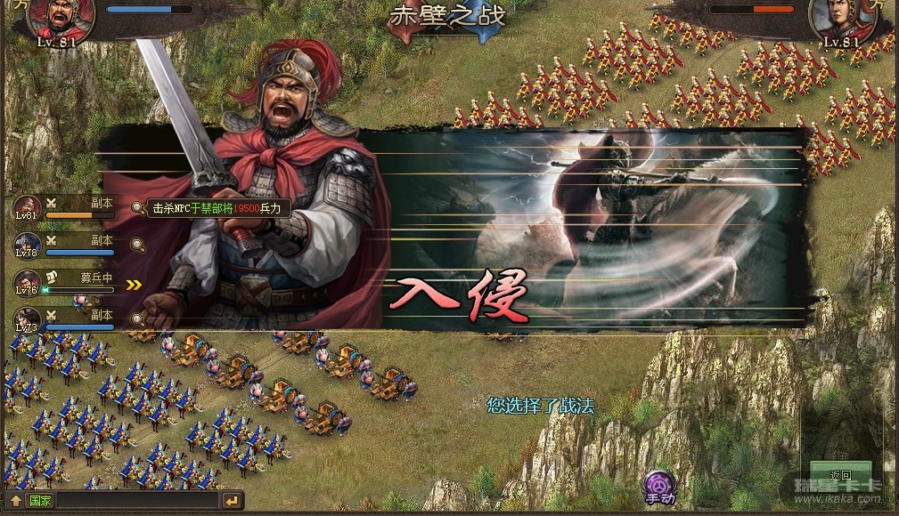 玩家部队在画面左下,敌方部队在画面右上,战斗开始后前进到画面中央进行交战。