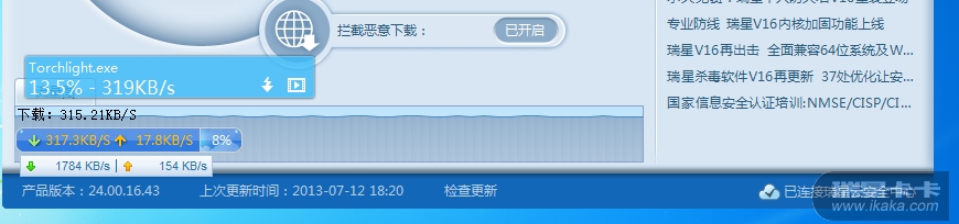 最后还想说一个关于瑞星杀毒和防火墙的问题,当我的网络速度全开的时候,比如说全速进行下载,瑞星杀毒和防火墙就会失去和云安全中心的连接(界面上是这么显示的),不过安全助手则没有(起码界面显示是还连接的),但是只要下载软件速度降下来一些就会又显示连接到云安全中心。  题外话:瑞星免费了也有了一些安全外的推广,这些推广没有给我造成多少麻烦,也是免费应该的,但是作为一个瑞星老用户了,不知道以后能不能推出一个免费版的一个付费版的,还是更喜欢付费使用,纯粹而安心。