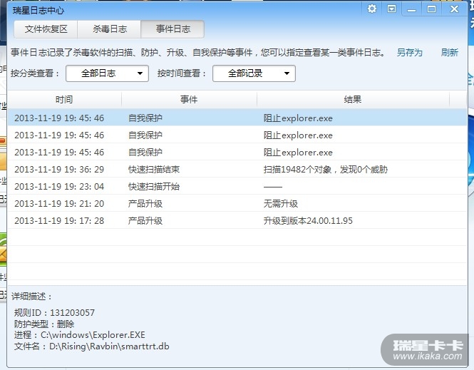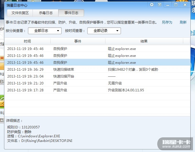 就是重置IE一键还原到最初的安装状态,结果在恢复过程中瑞星阻止了许多浏览器的相关文件,而且启用了自我保护功能。要不您先下载我的附件,在转交给相关的工程师,让他们帮我分析分析。谢谢!