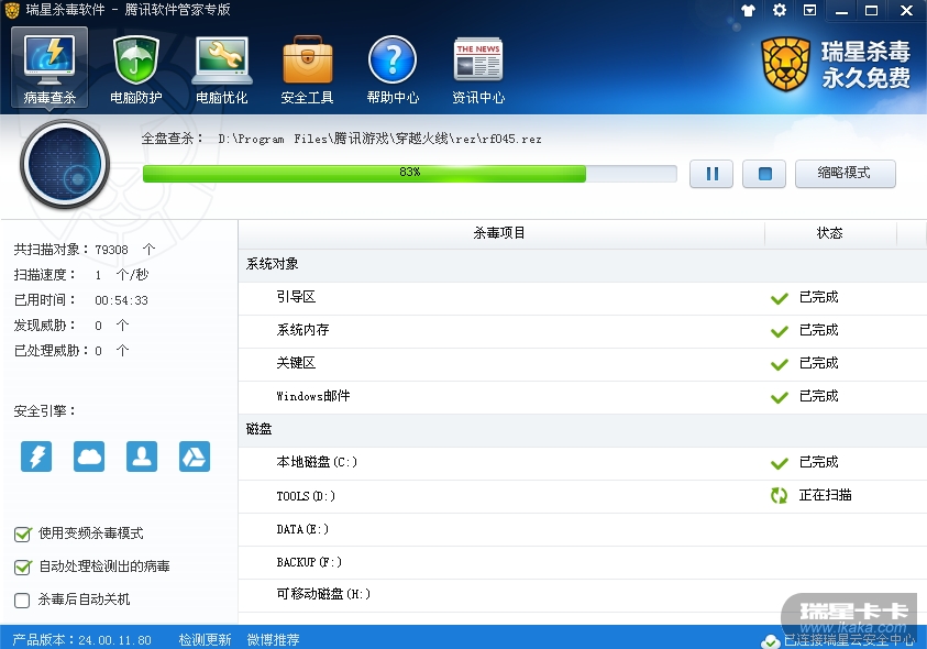 我同时使用瑞星和Q管家全盘杀毒,瑞星是每秒1个,Q管家是每秒48个