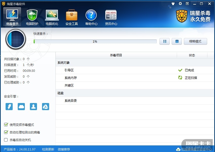 前几天单位的V16版本的瑞星则是点全盘杀毒就会卡在引导盘0%,也是无法升级,昨天还是前天才可以升级的,然后才可以杀毒。