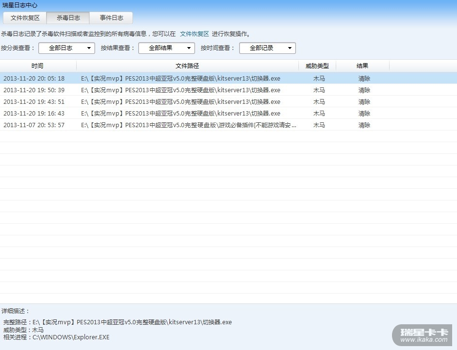 前天我把那个文件加进白名单,它就没事了。 今天又有另外一个exe文件删了,还是同样的问题,恢复区找不到,估计也把它加到白名单再重启一下就成了,不过这到底是真有病毒还是瑞星犯病啊?怎么老是删exe 而且还都是游戏呢?