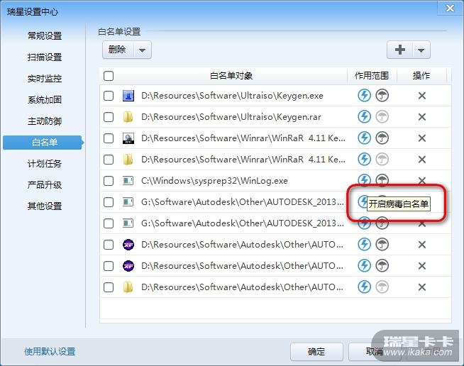 瑞星杀毒软件V16+白名单设置中,作用范围一栏下面的状态图标及其提示标签的意义不明确,请详细解释并改进一下!