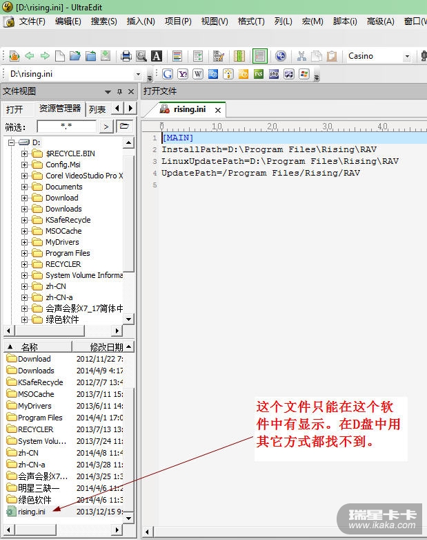 今天因事使用UltraEdit软件,打开D盘时发现有一个 rising.ini 文件。但我打开电脑的D盘,选择了“显示隐藏的文件、文件夹……”但找不到这个文件。用UltraEdit打开这个文件,发现是指向瑞星杀毒软件的配置文件,(我的瑞星杀毒软件安装在D盘)而且文件头有一个特别的锁。请问:这是一个正常的文件吗?