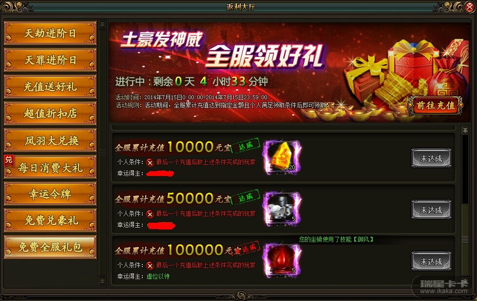 土豪发神威,全服领好礼活动创世来袭,凡全服累计充值达到一定数额,玩家个人满足一定的条件即可领取各种超值大礼【活动时间】8月1日-8月5日【活动范围】未在开服活动中的区服【活动内容】活动期间,全服累计充值达到一定的数额,同时玩家个人满足一定的条件,即可领取超值豪礼,奖励多多,不容错过喔~最后一名完成充值条件的玩家还有惊喜收获喔【活动一览】: