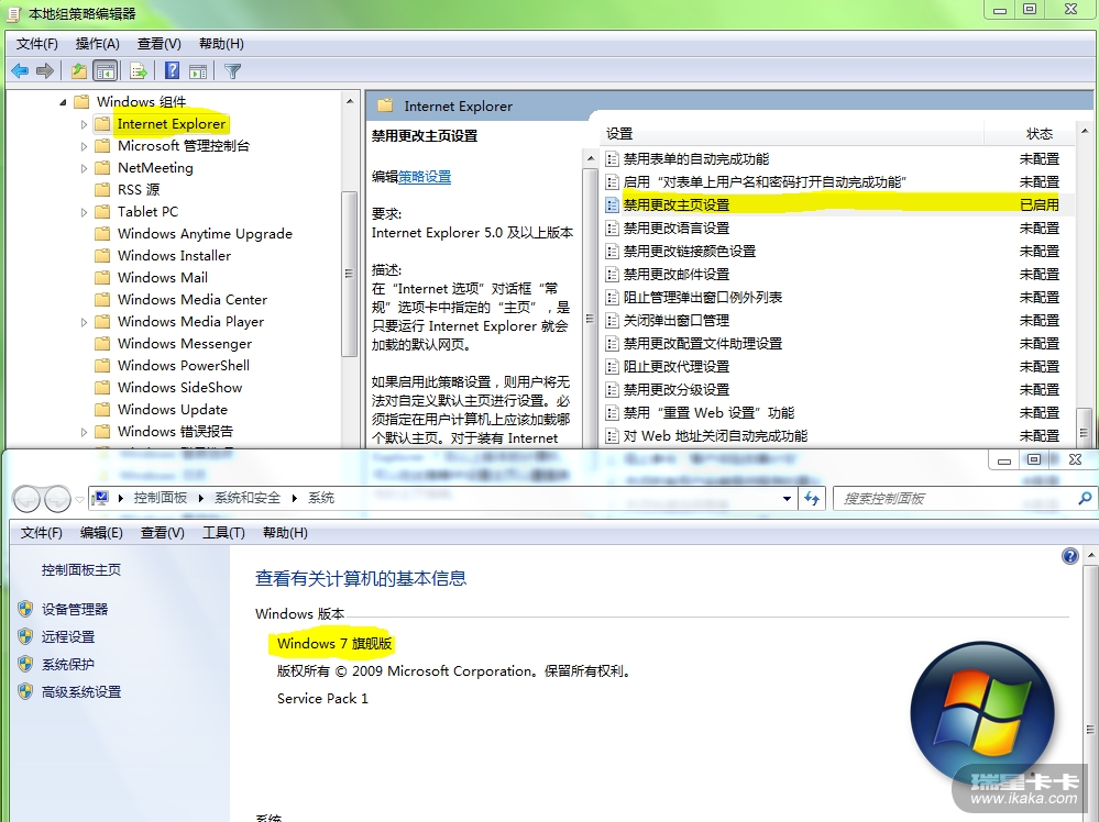 设置里有“禁用更改主页设置”这个选项。非旗舰版的win7,可能没有组策略设置。