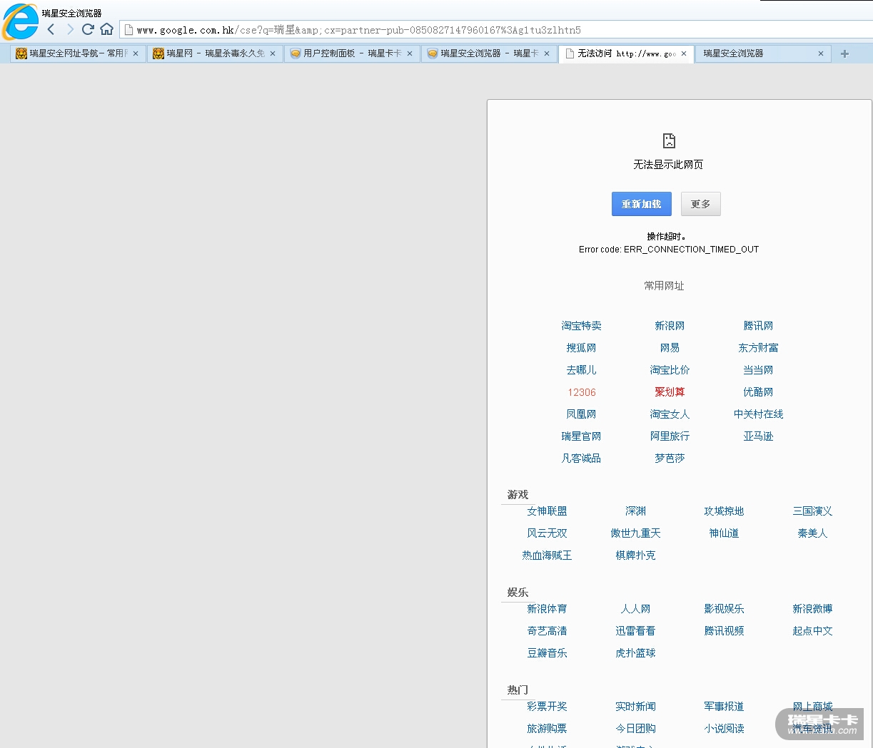 在测试瑞星安全浏览器谷歌搜索引擎时,发现打不开网页。建议把它取消。(如图所示)