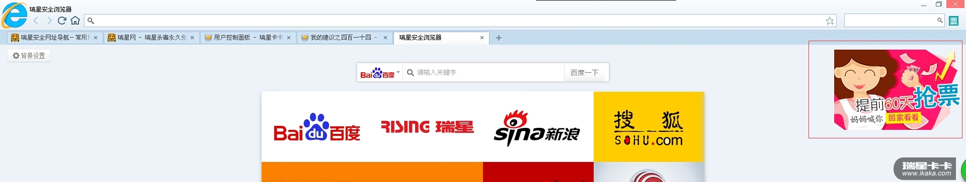 打开新的标签页,看到标有“提前60天抢票,妈妈喊你回家看看”的广告,建议把它取消或已其它方式进行显示。(如图所示)