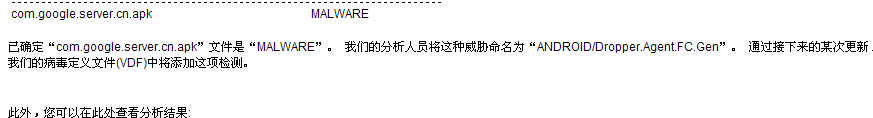 建议瑞星公司重新分析com.google.server.cn.apk这个应用,截图来自小红伞官方邮件