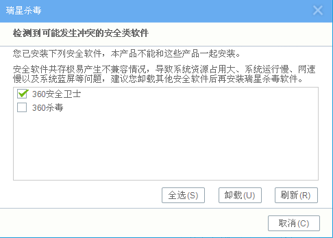 瑞星v17官网版不能和360卫士同时安装,提示需要卸载360,但因某种原因,不想卸载360,所以希望能够提供一个支持同时安装的选项,谢谢
