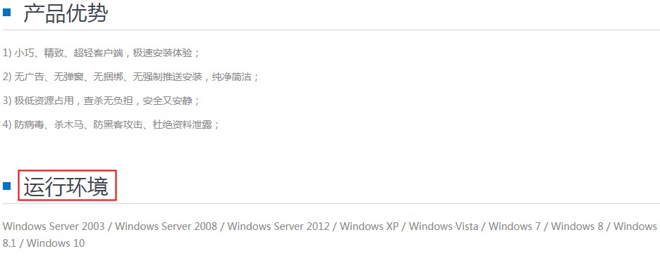 浏览瑞星官网时,发现有一处罗里吧嗦的地方,还可以更为简洁的语言文字描述。我觉得直接把“操作系统”、“运行环镜”里的内容全部修改为“