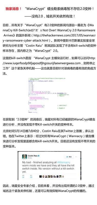 原理:通过“WanaCrypt”蠕虫敲诈病毒的“域名”开关灭活
