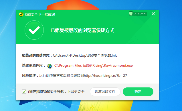 每次开机都会这样提示!是每次,一次不漏!如果我点了恢复风险文件,主页地址就变成瑞星导航页了,就是360也没这么流氓吧?
