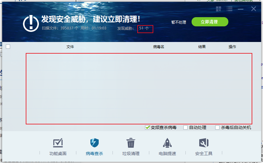 2、发现了多个 病毒,但是没有显示, 并且 我点击 处理时, 瑞星 没有任何反应