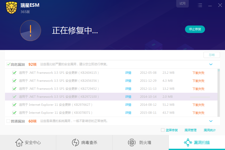 ESM365客户端无法修复漏洞,是不是就是不能修复漏洞?办公的外网电脑,win7的64位系统。换成手机共享wifi的网络,也不能修复,可以扫描出漏洞,但不能修复,见图。