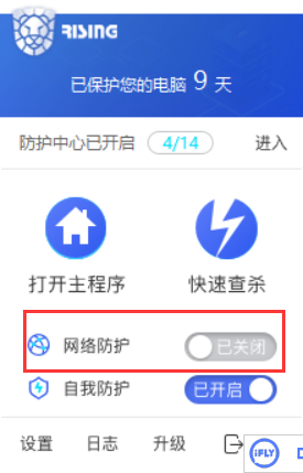 第二步,现在神奇的事情来了,无论是你通过桌面快捷方式还是右键托盘图标打开主界面,网络防护自己就又打开了。。。。