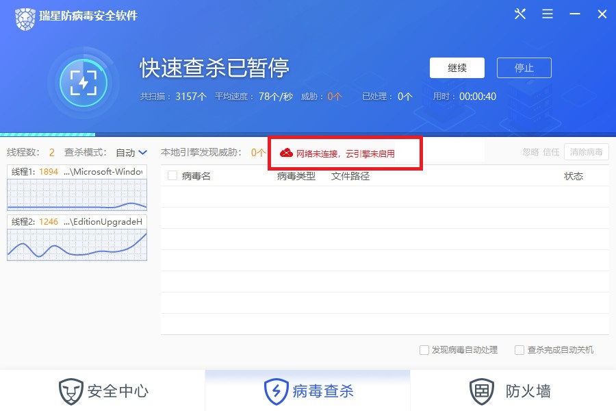 瑞星查杀使用本地引擎和云引擎双模形式,但是在断网或瑞星未联网状态,云引擎是未启动的。但是瑞星软件并没有任何提示,建议瑞星对主界面进行修改。